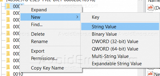 6. Right-click on the matched folder and create new “String Value”.