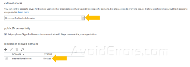 Depending upon the setting selected under external access the domain status will be shown as Blocked or Allowed.