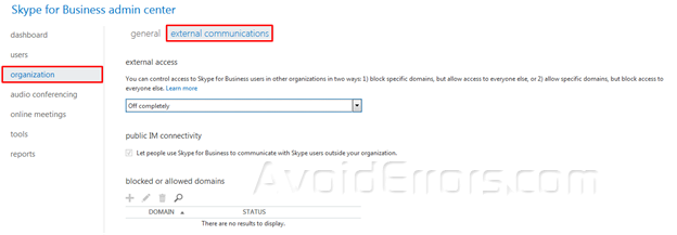 Note: The admin of the external organization also need to do turn on External Communication for Skype for Business to allow two users from different organizations to chat, make voice/video calls, share a screen and use other collaborative features offered by Skype for Business.