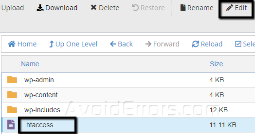 Locate the ‘.htaccess’ file in your root directory. Ensure you can view hidden files. Select the file then click on the ‘Edit’ button at the top.