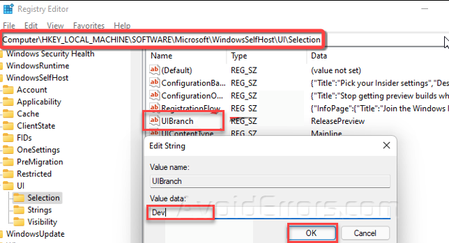 Next, you’ll need to update special Registry keys and turn from Release Preview Version to Dev Preview Version.