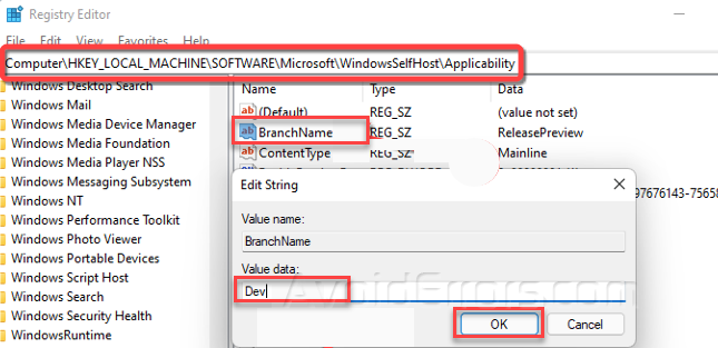Now you will see “BranchName” key on the right side, double click on it, and type “Dev” in the “Value data” section.