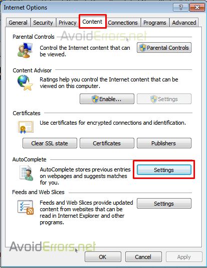 Click the “Content” tab and then click the “Settings” button to the right of AutoComplete.