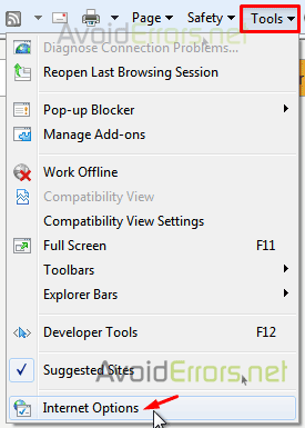 In Internet Explorer, click menu -> Internet Options.